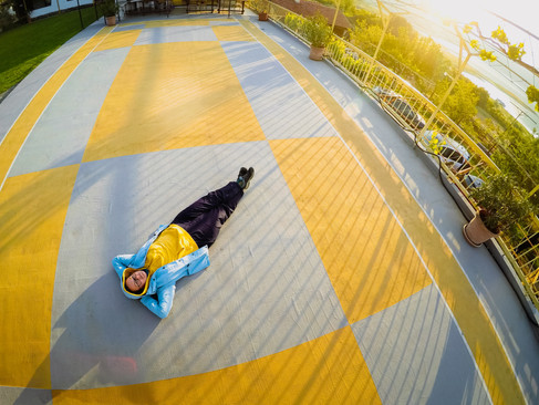 I had an idea for April that failed because of the weather. It was once again the last few days of the month. A last-minute spot opened on an adventure to lands unknown to me and I had to say yes. I was told we were going to a village but we stayed in another one and that traveled between the two. That caused me to be underprepared. We stayed right next to a lake and had an amazing view. I walked up over to see the lake better and there it was. A blue and yellow area while I was wearing my yellow sweatshirt and my blue jacket... And I didn't bring my drone... I did my best with what I had, a mountable GoPro. As I was doing my little photoshoot people started waking up and going outside... Where I was. It felt weird being comfortable doing it alone in public and yet, there was I, not giving a flying fuck while having fun with it.